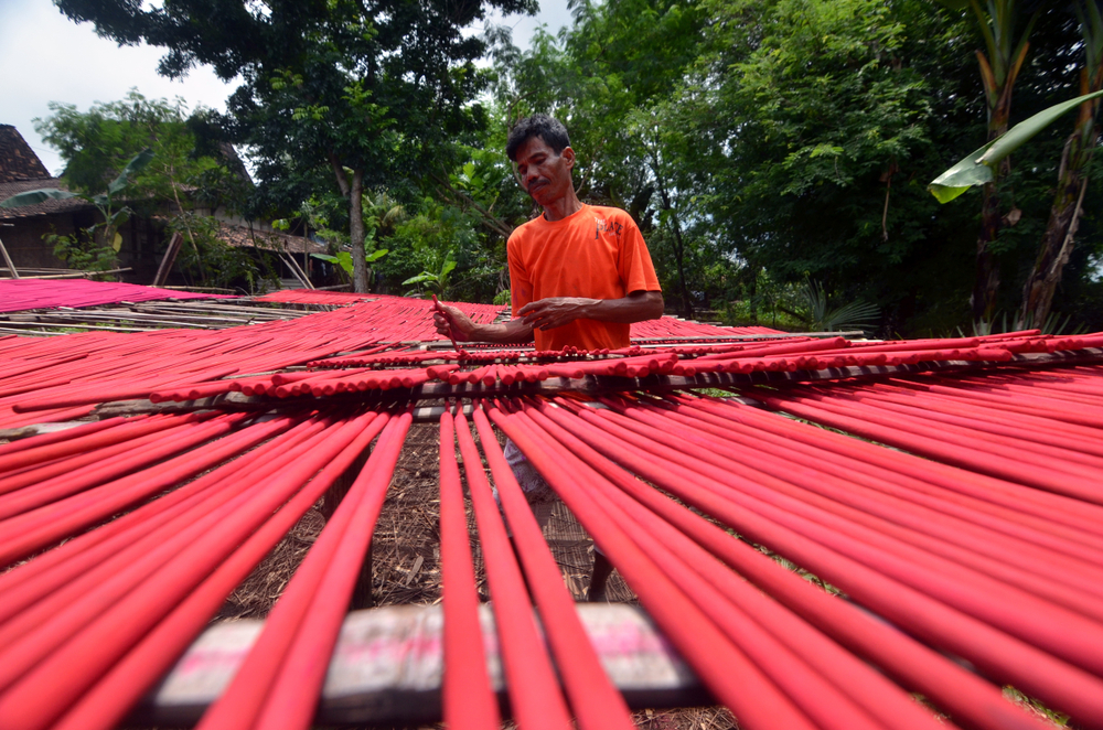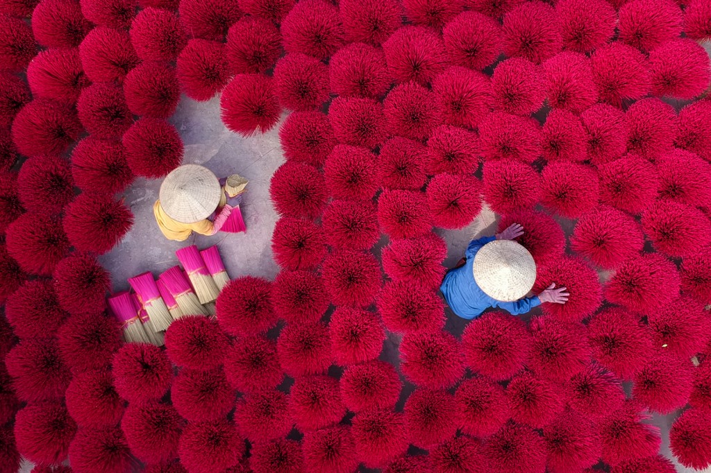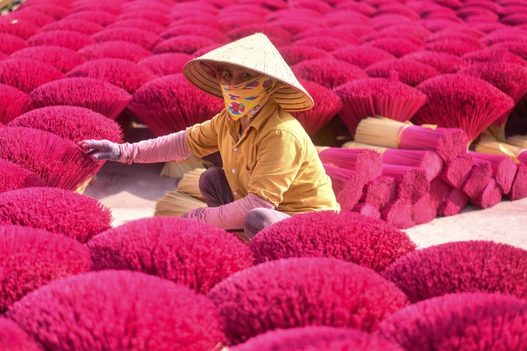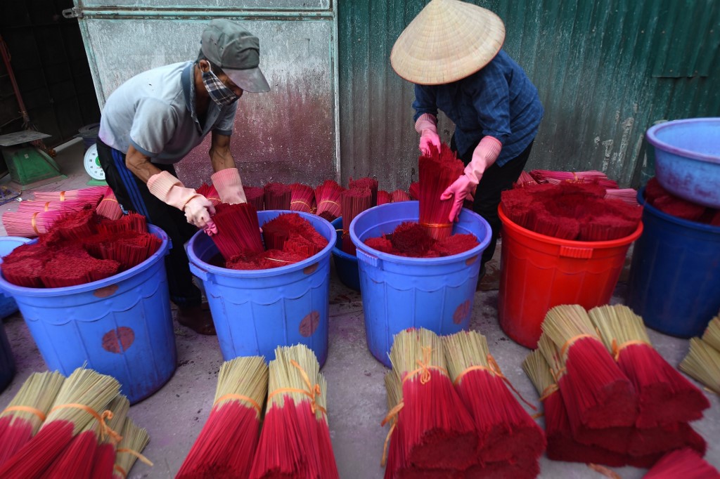 Hundreds of workers are busy dyeing, drying and whittling down bamboo bark to make incense sticks. The village of Quang Phu Cau on the outskirts of Hanoi, or Vietnam’s ‘incense village’, turns a vibrant shade each year as the scented sticks are made ahead of the lunar new year holidays.