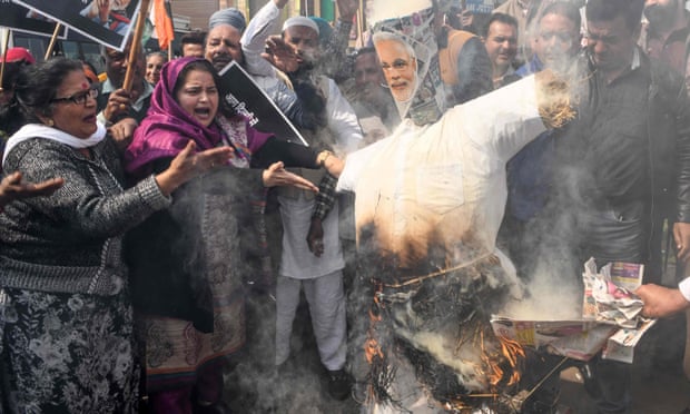 Congress party supporters in Amritsar burn an effigy of Narendra Modi during a demonstration to protest against the violence occurring in Delhi. Photograph: Narinder Nanu/AFP via Getty Images