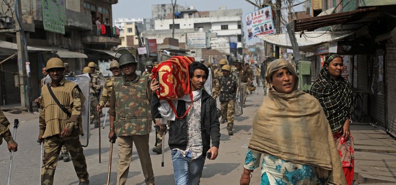 An Indian Muslim family leaves the area as Indian paramilitary soldiers patrol a street vandalized in Tuesday's violence in New Delhi, India, Thursday, Feb. 27, 2020. (AP Photo)