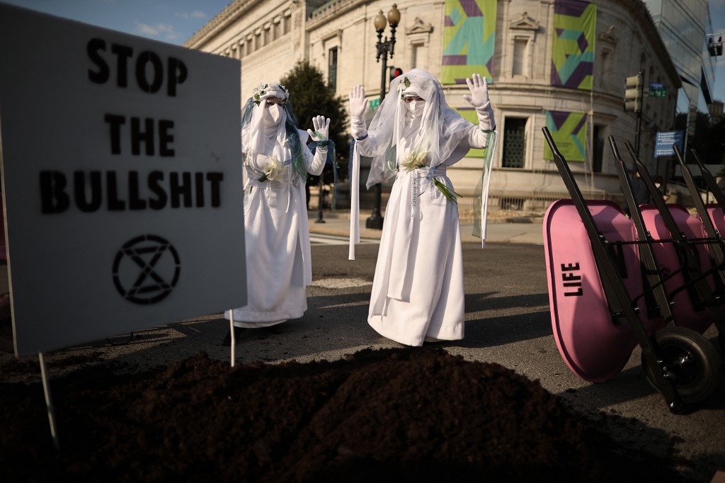 WASHINGTON, DC - APRIL 22: Activists halt traffic outside the White House while protesting against President Joe Biden's climate change policy on Earth Day, April 22, 2021 in Washington, DC. Organized by the Extinction Rebellion DC, protesters used bright pink wheelbarrows to dump heaps of cow manure at the intersection of New York Avenue and 17th Street NW on the west side of the White House campus. Despite the White House hosting a virtual Leaders Summit on Climate on Earth Day, the activists said Biden is "punting the crisis to future generations." Chip Somodevilla/Getty Images/AFP CHIP SOMODEVILLA / GETTY IMAGES NORTH AMERICA / Getty Images via AFP