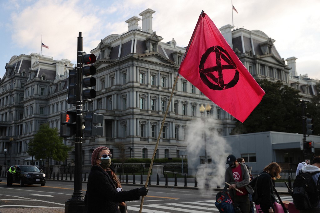 WASHINGTON, DC - APRIL 22: Activists halt traffic and dump a pile of manure outside the White House while protesting against President Joe Biden's climate change policy on Earth Day, April 22, 2021 in Washington, DC. Organized by the Extinction Rebellion DC, protesters used bright pink wheelbarrows to dump heaps of cow manure at the intersection of New York Avenue and 17th Street NW on the west side of the White House campus. Despite the White House hosting a virtual Leaders Summit on Climate on Earth Day, the activists said Biden is "punting the crisis to future generations." Chip Somodevilla/Getty Images/AFP CHIP SOMODEVILLA / GETTY IMAGES NORTH AMERICA / Getty Images via AFP