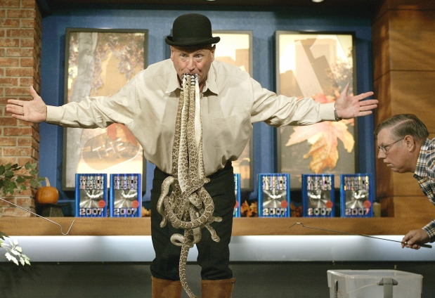 Jackie Bibby a.k.a. “The Texas Snakeman” holds in his mouth ten 2 ft 6-inch-long western diamondback rattlesnakes for 12.5 seconds without any assistance at the CW11 morning show on November 9, 2006 to set a new Guinness World Record for Most Live Rattlesnakes Held In Mouth. (AFP/ File Photo)