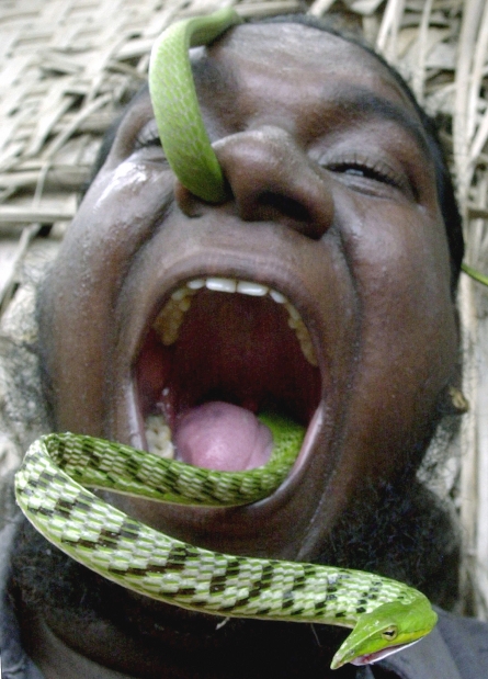 Indian man and Guinness World Record holder C. Manoharan popularly known as Snake Manu practices for a new record by putting a live snake up his nose and out through his mouth in Madras, September 2, 2004. (AFP/ File Photo)