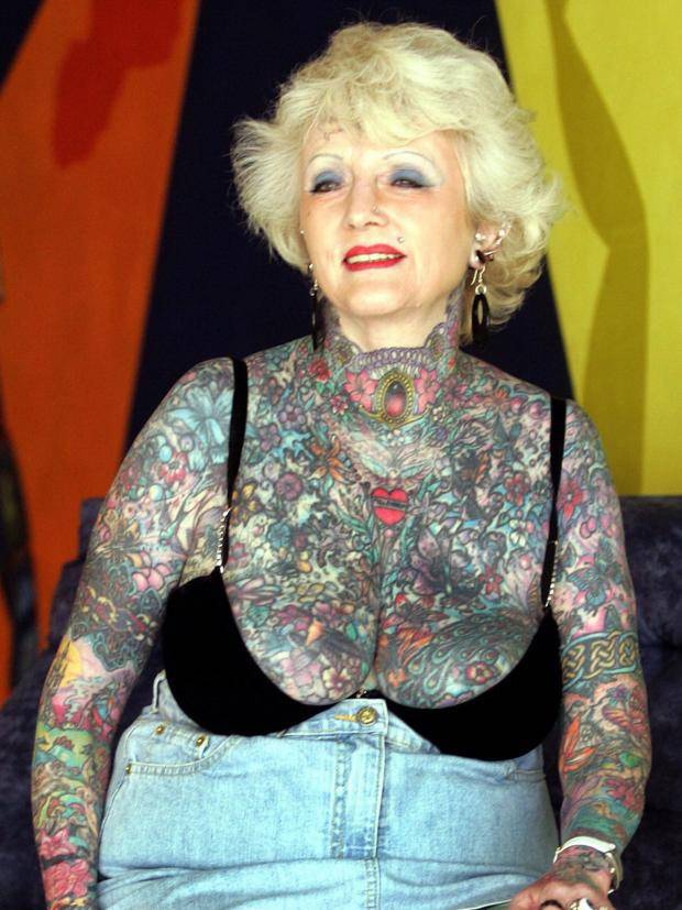 Briton Isobel Varley, 69, the world’s eldest tattooed woman according to the Guinness Book of Records, poses at a hotel in Buenos Aires, July 7, 2005. (AFP/ File Photo)