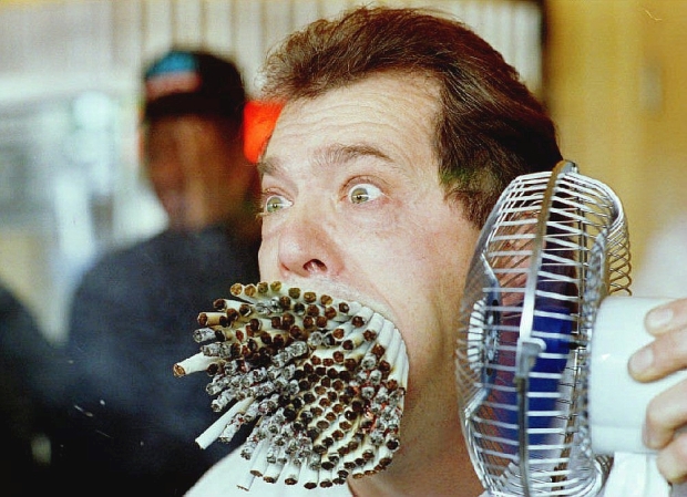 Jim Mouth uses a fan to blow smoke from 155 cigarettes as he breaks “The Guinness Book of World Records” record November 18, 1993 for smoking the most cigarettes at the same time. (AFP/ File Photo)