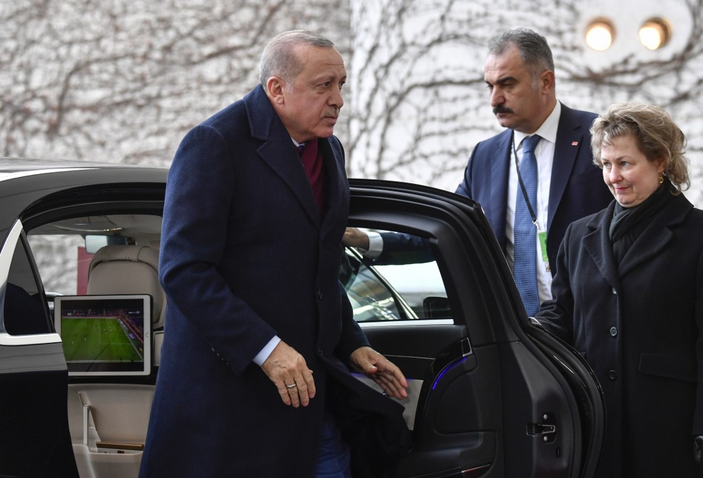 Turkish President Recep Tayyip Erdogan arrives to attend the Peace summit on Libya at the Chancellery in Berlin on January 19, 2020. World leaders gather in Berlin on January 19, 2020 to make a fresh push for peace in Libya. John MACDOUGALL / AFP