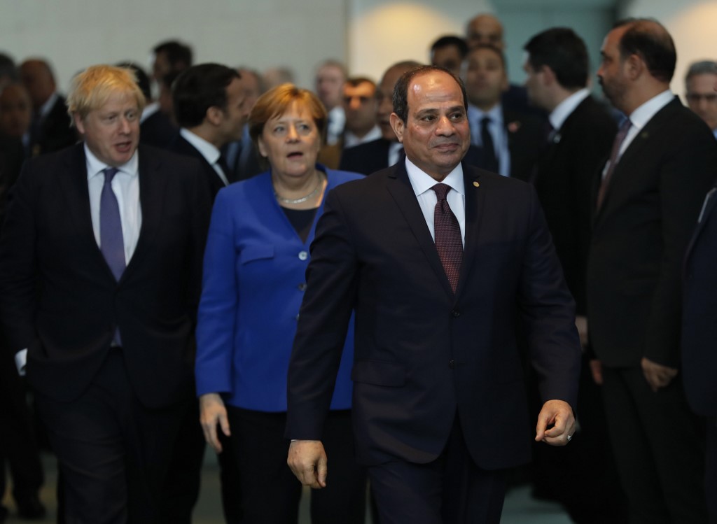 Egyptian President Abdul Fattah al-Sisi arrives for a family picture during a Peace summit on Libya at the Chancellery in Berlin, on January 19, 2020; back, from left: Britain's Prime Minister Boris Johnson and German Chancellor Angela Merkel. World leaders gather in Berlin. AFP