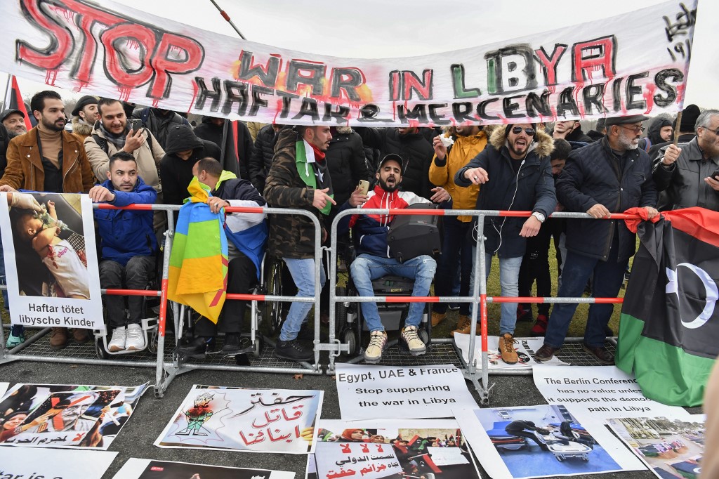 Protesters hold a banner reading "Stop war in Libya, Haftar and mercenaries" during a protest near the chancellery during the Peace summit on Libya at the Chancellery in Berlin on January 19, 2020.  AFP