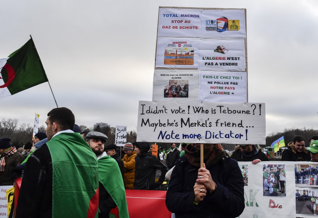 People stage a protest against Algerian president Abdelmadjid Tebboune during the Peace summit on Libya at the Chancellery in Berlin on January 19, 2020. AFP
