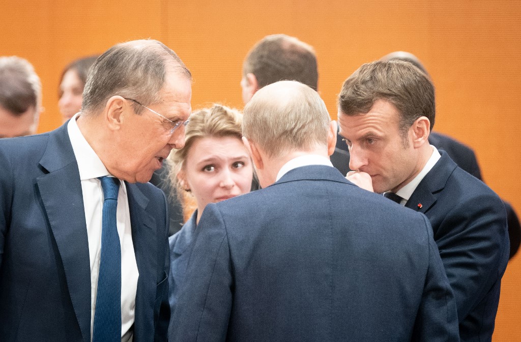 (L-R) Acting Russian Foreign Minister Sergei Lavrov, Russian President Vladimir Putin and France's President Emmanuel Macron talk at the start of a Peace summit on Libya at the Chancellery in Berlin, on January 19, 2020. Kay Nietfeld / POOL / AFP
