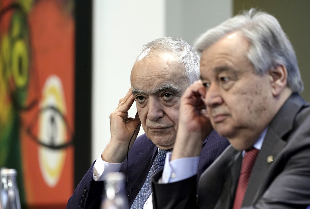 Special Representative and Head of the United Nations Support Mission in Libya (UNSMIL) Ghassan Salame (L) and Secretary-General of the United Nations (UN) Antonio Guterres listen during a press conference at the end of a Peace summit on Libya at the Chancellery in Berlin on January 19, 2020. AFP