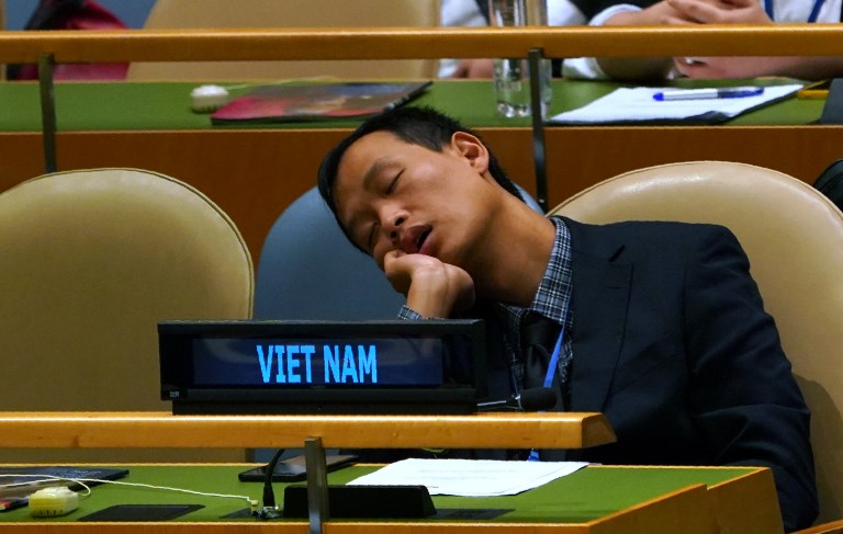 A member of Vietnamese delegation naps during the General Debate of the 73rd session of the General Assembly at the United Nations in New York September 25, 2018. Don EMMERT / AFP