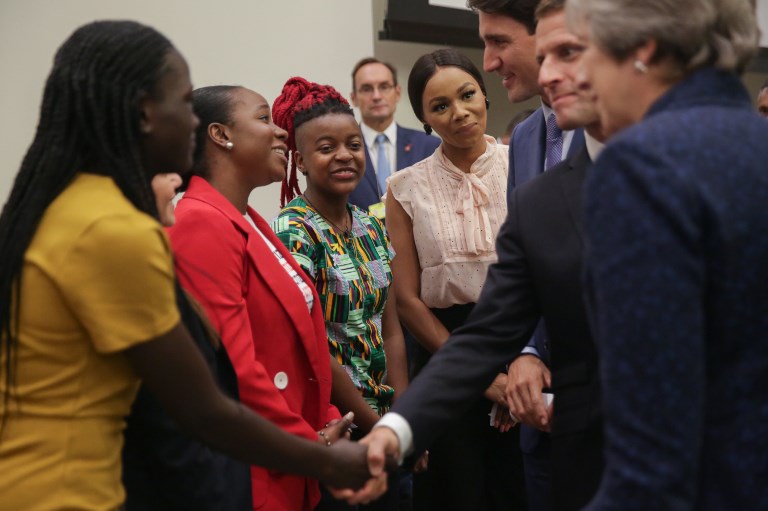 A woman reacts as British Prime Minister Theresa May (L), French President Emmanuel Macron (C) and Canadian Prime Minister Justin Trudeau (R) greet a group of women ahead the start of a Girl Education event at UN headquarters during the General Assembly of the United Nations in New York, September 25, 2018. AMR ALFIKY / AFP / POOL