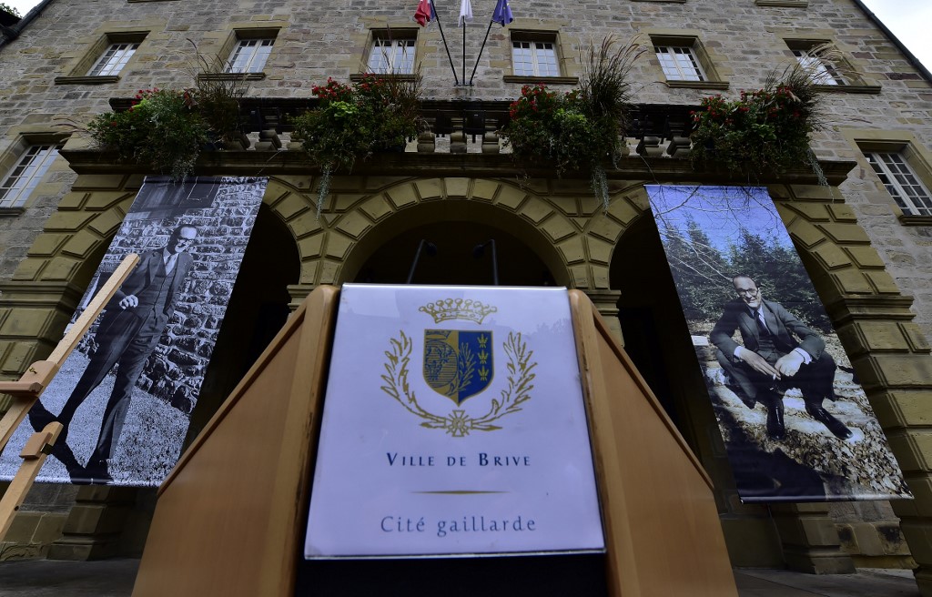 Pictures of late French president Jacques Chirac are displayed outside Brive-la-Gaillarde city hall, on September, 30 2019, during a memorial ceremony as part of a national day of mourning. GEORGES GOBET / AFP