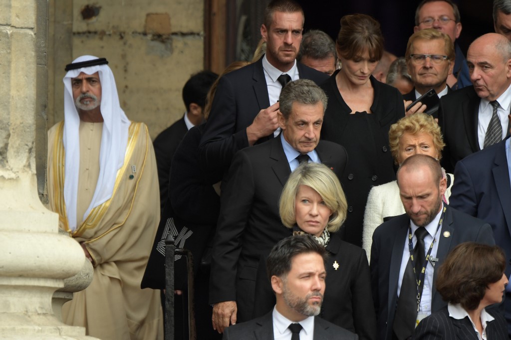 France's former President Nicolas Sarkozy (C) leaves after attending a church service for former French President Jacques Chirac at the Saint-Sulpice church in Paris on September 30, 2019. Former French President Jacques Chirac died on September 26, 2019 at the age of 86. Eric FEFERBERG / AFP