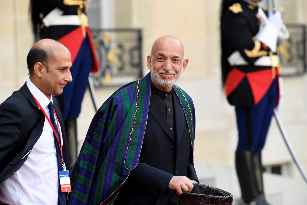 Former Afghan President Hamid Karzai (C) gestures as he leaves The Elysee Presidential Palace in Paris on September 30, 2019, following a luncheon after a church service for former French President Jacques Chirac. Former French President Jacques Chirac died on September 26, 2019 at the age of 86. Bertrand GUAY / AFP