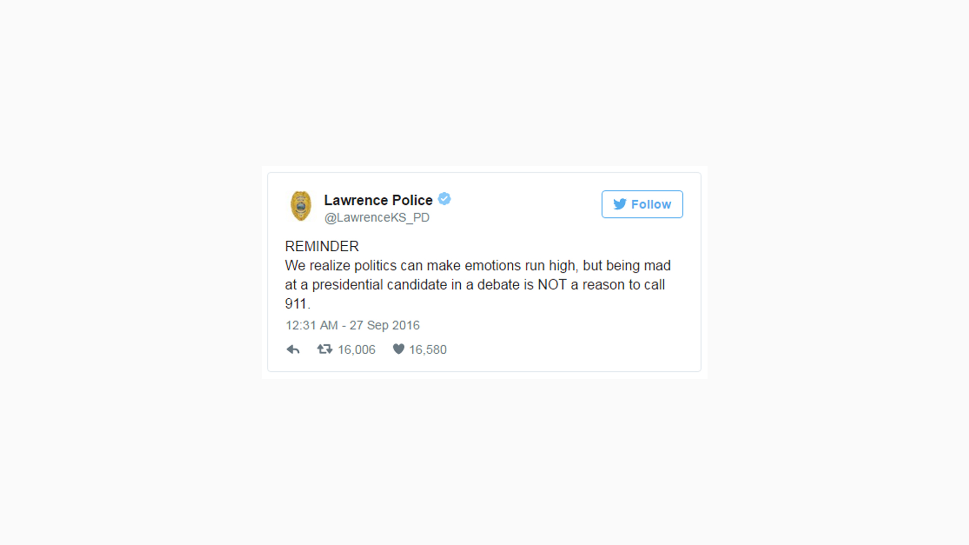 The police jumped in too! A Kansas police department advised the public that being angry at a candidate did not warrant a call to 911.