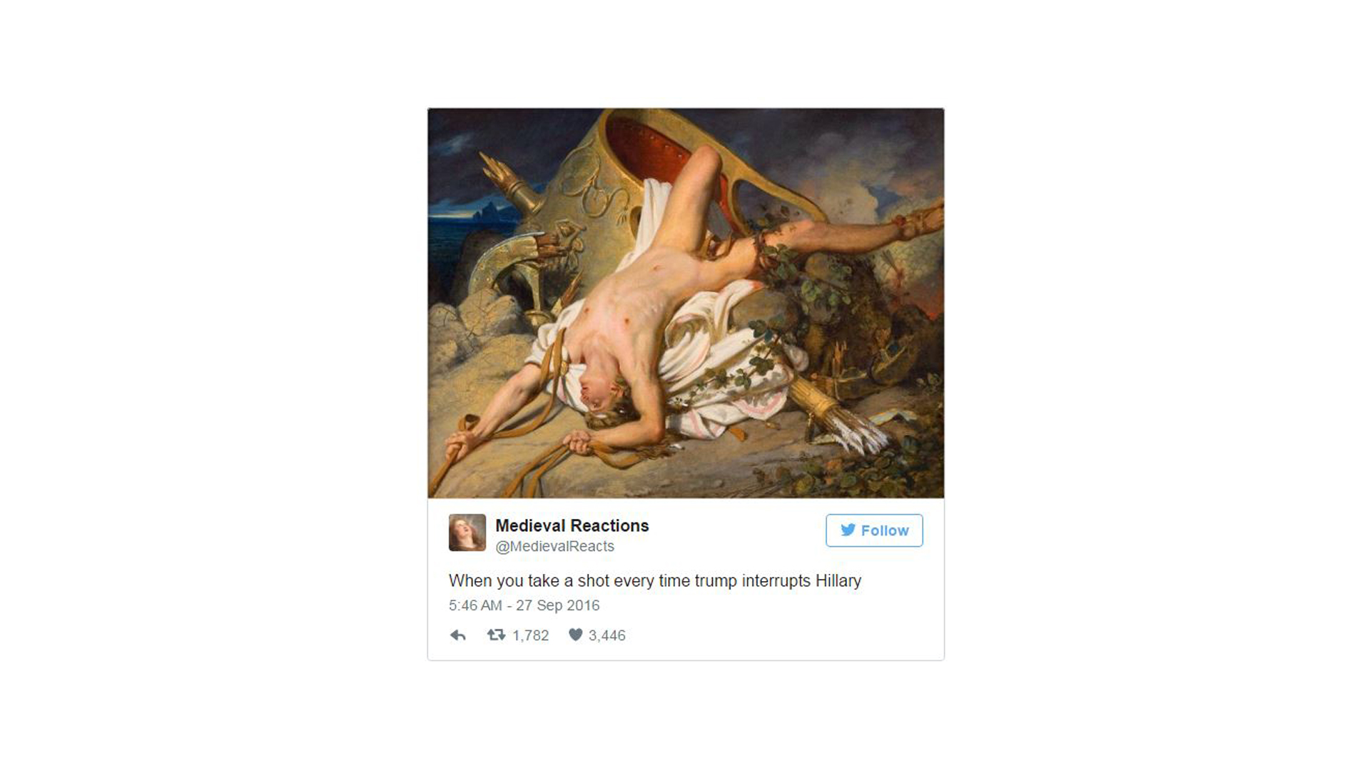 Riffing on the Republican's style of "debatus interruptus", this viewer artfully memed, "When you take a shot [of alcohol] every time Trump interrupts Hillary."