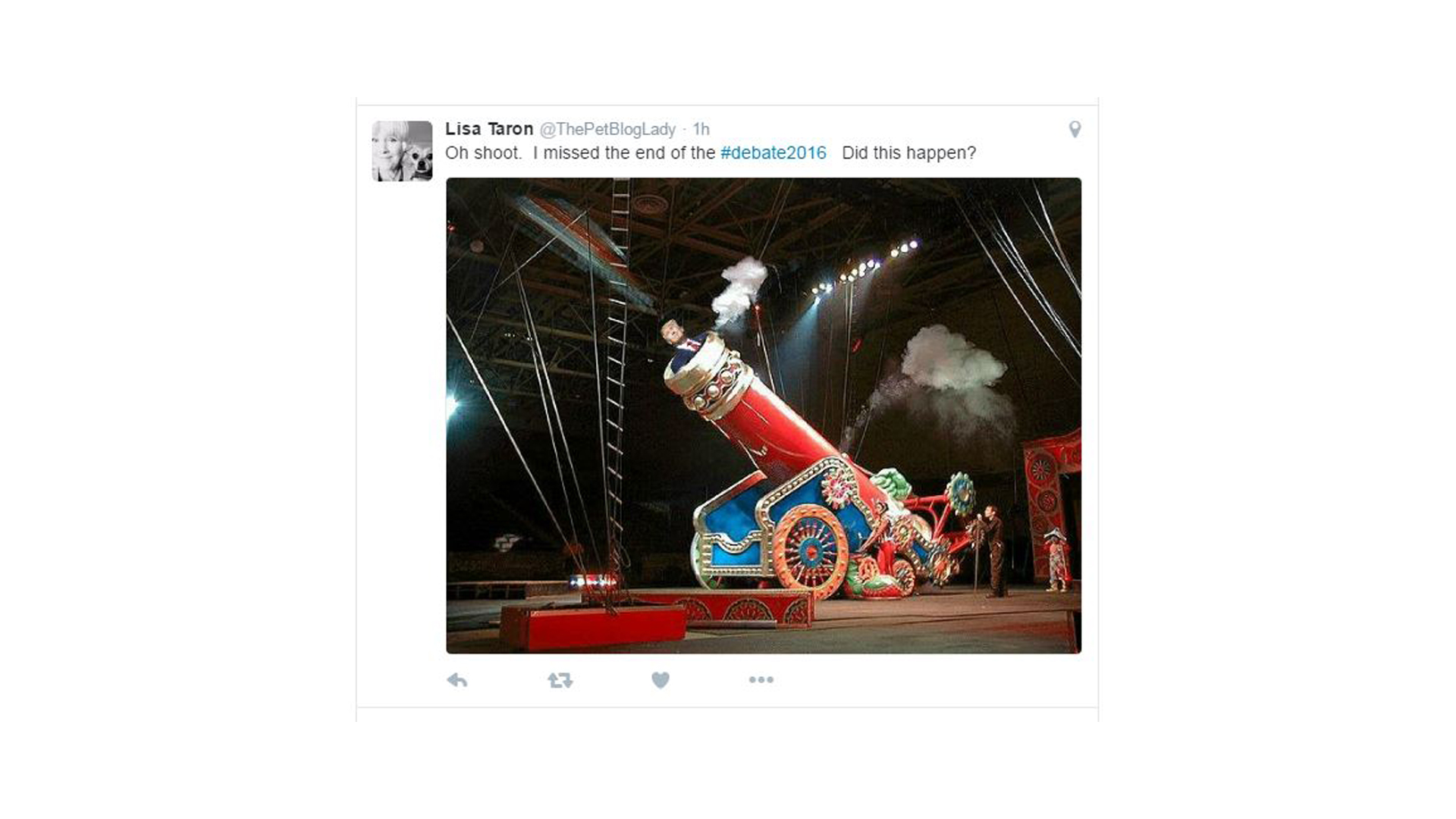 But most messages stuck to jokiness, like blasting Trump out of a circus cannon, wondering, "Oh Shoot. I missed the end of the #debate2016. Did this happen?"