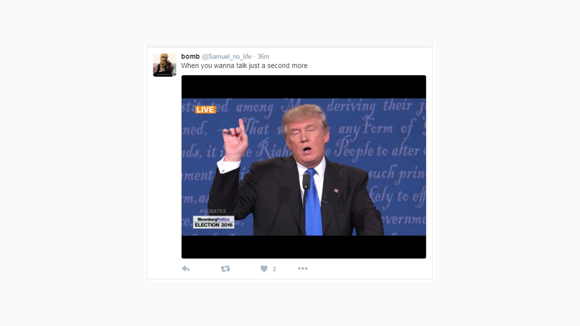A gentle tease on Trump's trademark technique of talking over time limits, one twitterer memed the candidate with the tag, "When you want to take a second more..."