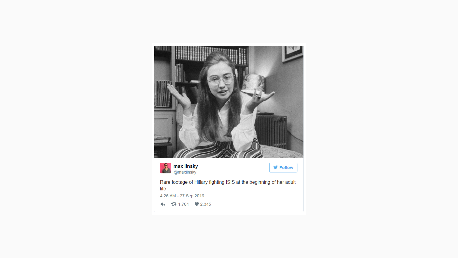 Social media allowed instantaneous commentary to the livestream conversation. Accused of failing to prevent the spread of terrorism during her 30-year career in politics, this viewer posted "Rare footage of Hilary fighting ISIS at the beginning of her adult life".