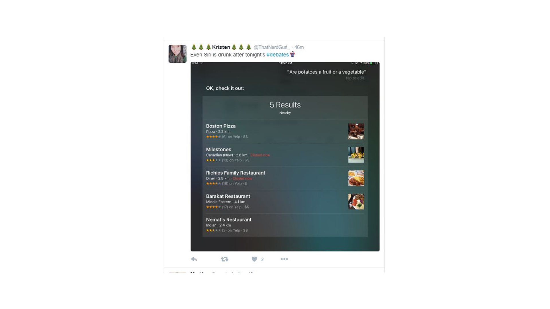 One viewer posted that even her Siri got smashed, tipsily answering her query "Are potatoes a fruit or a vegetable?" with recommendations for a pizza joint and Middle Eastern cafe.