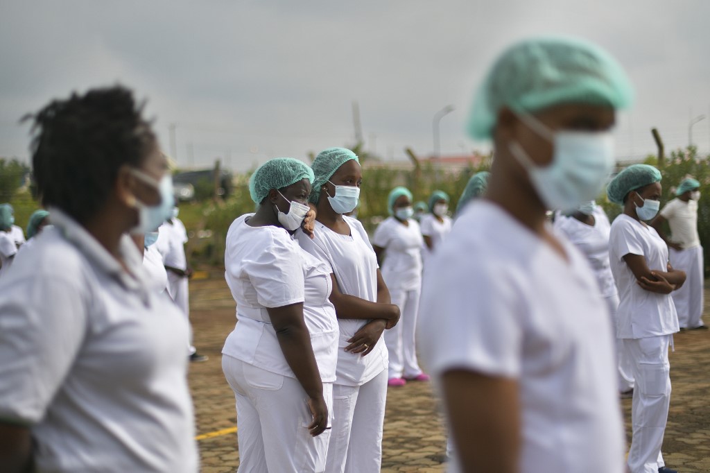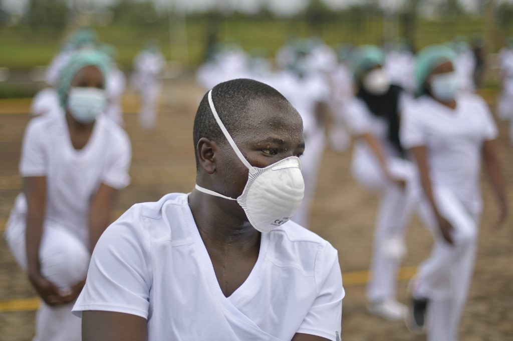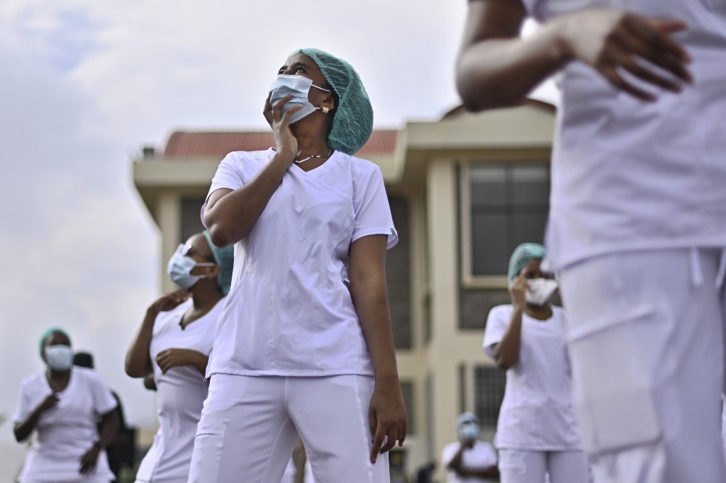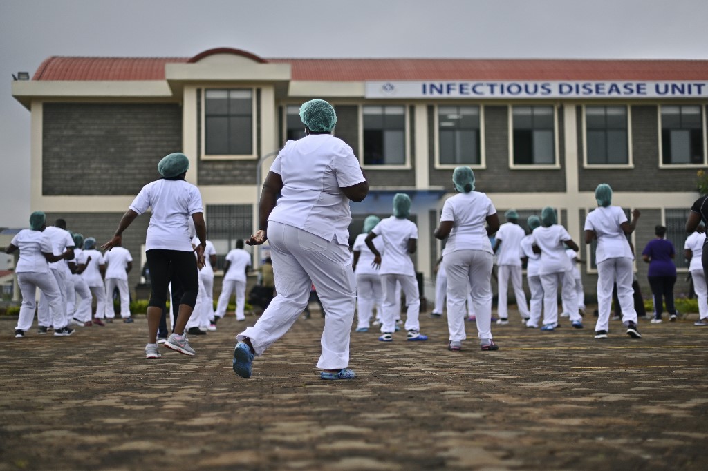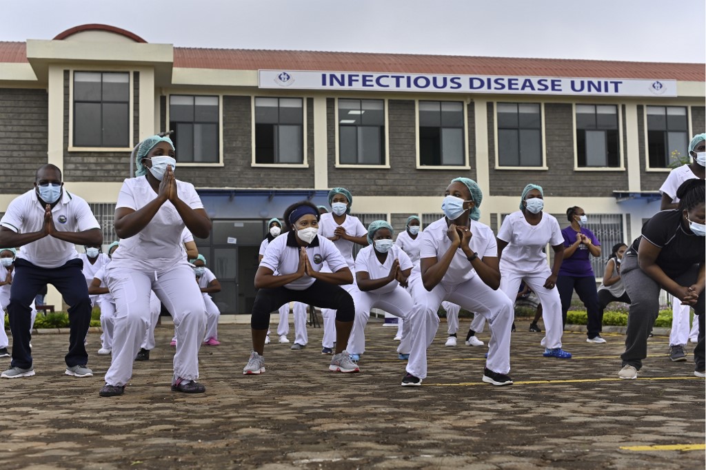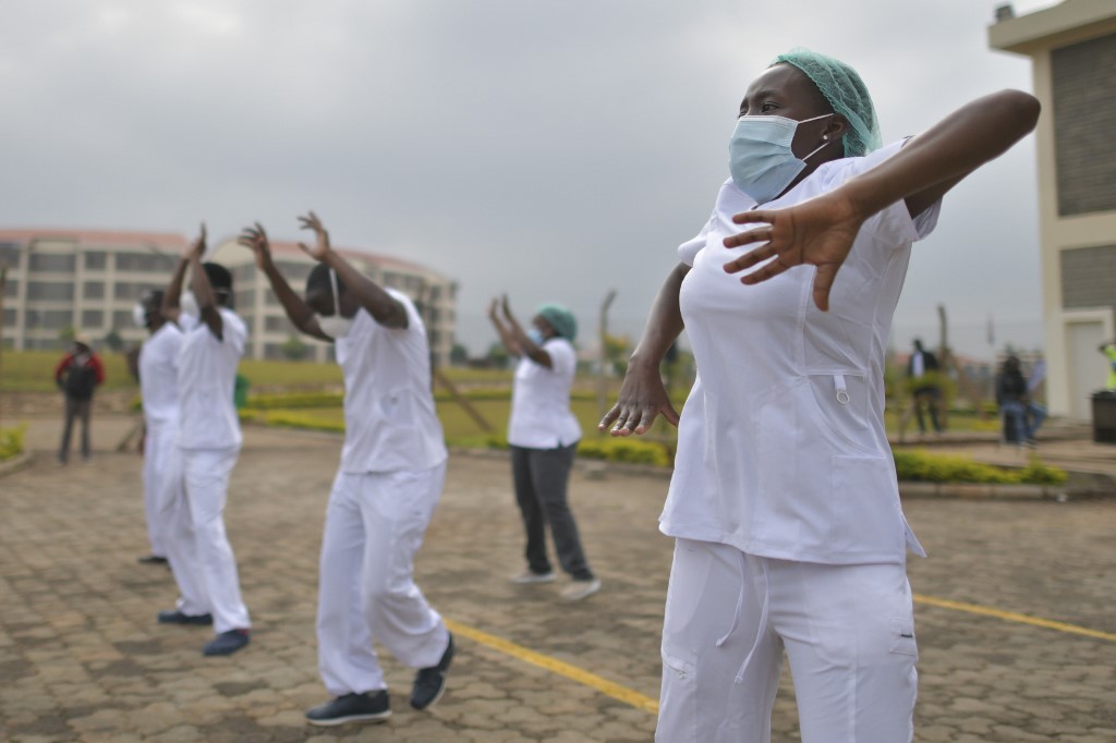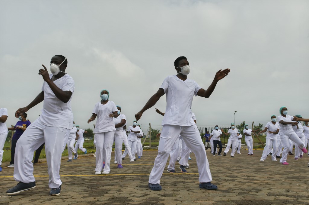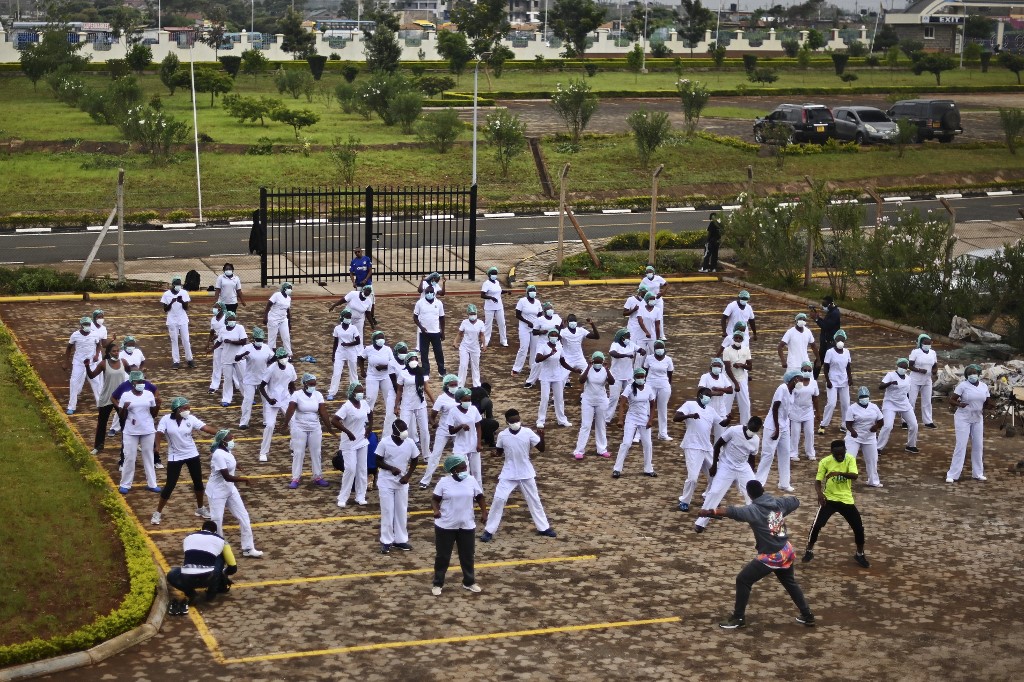 Nurses assigned to the Infectious Diseases Unit (IDU) at the Kenyatta University Hospital dance during a Zumba class held at the hospital compound in Nairobi, on May 17, 2020, according to AFP.