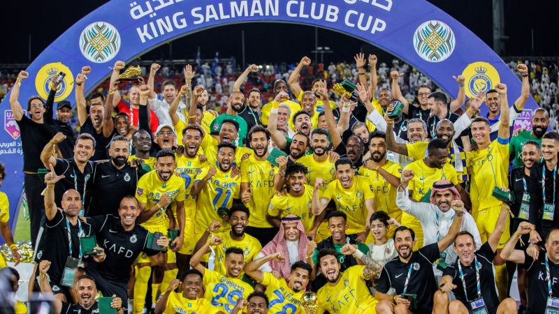 Nassr's players celebrate winning the 2023 Arab Club Champions Cup after their final football match between Saudi Arabia's Al-Hilal and Al-Nassr at the King Fahd Stadium in Taif on August 12, 2023. (Photo by AFP)
