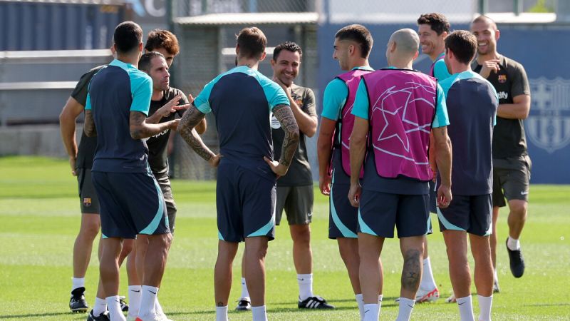 Barcelona's Spanish coach Xavi (C) talks with Barcelona's players during a training session ahead of the UEFA Champions League football match between FC Barcelona and Royal Antwerp FC, at the training ground in Sant Joan Despi, near Barcelona, on September 18, 2023. (Photo by LLUIS GENE / AFP)