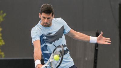 Serbian tennis player Novak Djokovic hits a return during a practice session ahead of the ATP Adelaide International tournament, in Adelaide on December 30, 2022. (Photo by Brenton EDWARDS / AFP)