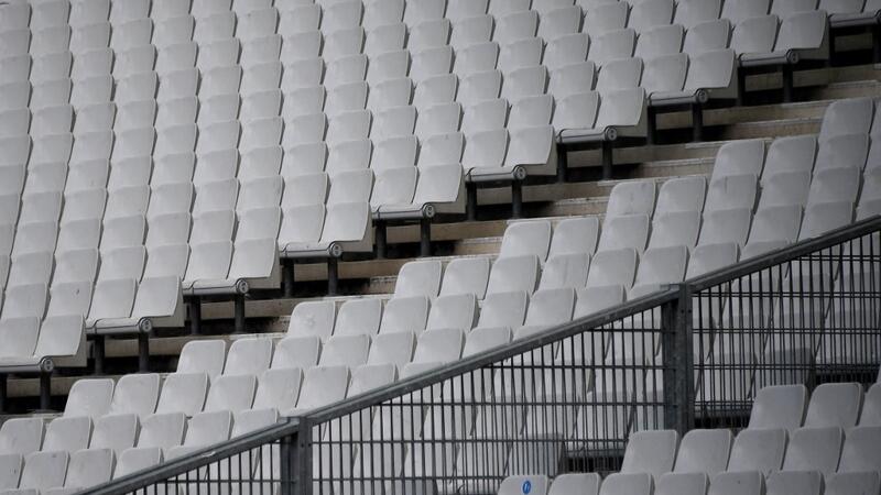 Empty seats in the grandstand of the "Stade de France" in Saint-Denis amid the spread of the COVID-19 pandemic, caused by the novel coronavirus.