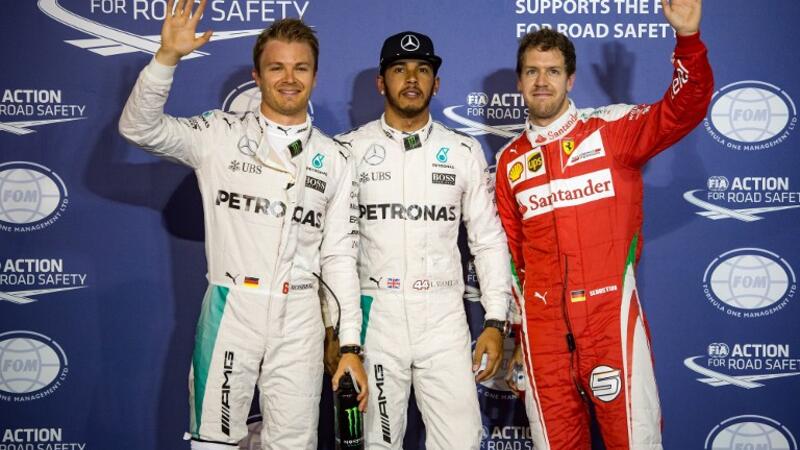 Mercedes AMG Petronas F1 Team's British driver Lewis Hamilton (C) stands next to Mercedes AMG Petronas F1 Team's German driver Nico Rosberg (L) and Ferrari's German driver Sebastian Vettel after securing the pole position in the Bahrain Formula One Grand Prix following the qualifying session at the Sakhir circuit in Manama on April 2, 2016, a day ahead of the race. AFP PHOTO / ANDREJ ISAKOVIC ANDREJ ISAKOVIC / AFP
