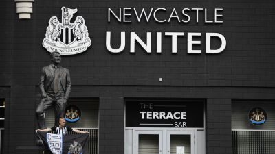 A picture shows the Newcastle United logo outside the club's stadium St James' Park in northeast England on October 8, 2021. (Photo by Oli SCARFF / AFP)