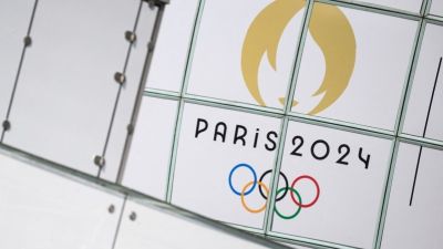 This photograph shows the logo of Paris 2024 Olympic games in front of skyscrapers at La Defense buisiness district on July 22, 2024, ahead of the Paris 2024 Olympic and Paralympic games. (Photo by Loic VENANCE / AFP)