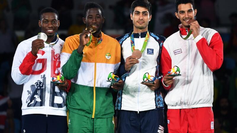 (L-R) Silver medalist Great Britain's Lutalo Muhammad, gold medalist Ivory Coast's Cheick Sallah Junior Cisse and bronze medalists Azerbaijan's Milad Beigi Harchegani and Tunisia's Oussama Oueslati pose with their medals on the podium after the men's taekwondo event in the -80kg category as part of the Rio 2016 Olympic Games, on August 19, 2016, at the Carioca Arena 3, in Rio de Janeiro.